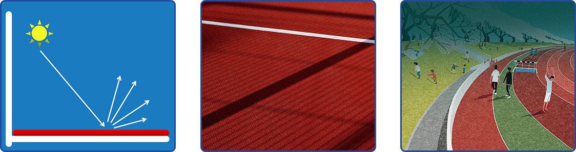 全塑型塑胶跑道材料具有自流平效果,固化后表面平坦,符合比赛场地要求,采用专用的高弹性EPDM颗粒喷面,颗粒状表面防眩目工艺能有效地遏制刺眼光线反射,提供适度的运动摩擦系数,并可定制多种色彩搭配场地方案。