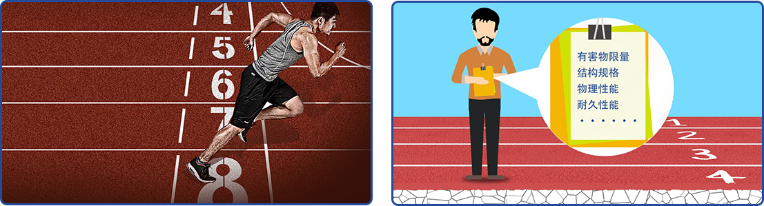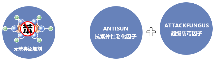 材料生产应用无苯类添加剂环保技术,独特的ANTISUN抗紫外性老化因子和ATTACKFUNGUS超级防霉因子也替代了传统的人工合成紫外线吸收剂和抗氧化剂,更出色地为环保跑道提供抗老化、防霉菌等多重保护。